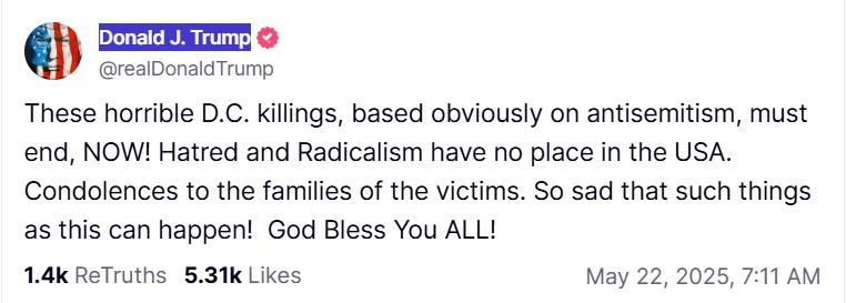 "Эти ужасные убийства в Вашингтоне, в основе которых, очевидно, антисемитизм, должны прекратиться сейчас! Ненависти и радикализму нет места в США. Соболезнования семьям жертв. Так грустно, что такие вещи могут происходить! Да благословит вас всех Бог!" – написал Трамп.