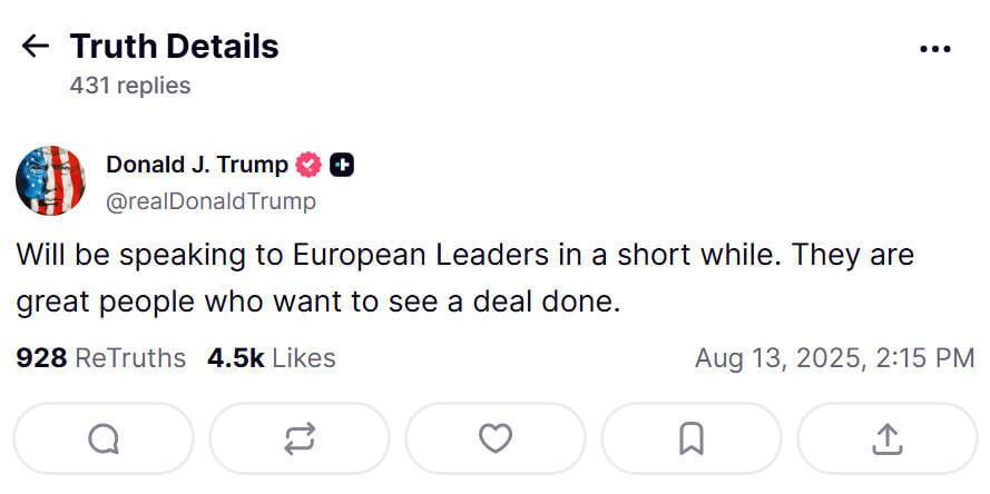 "Вскоре буду разговаривать с европейскими лидерами. Это прекрасные люди, которые хотят, чтобы [мирное] соглашение [между Украиной и РФ] было заключено", – отметил американский президент.