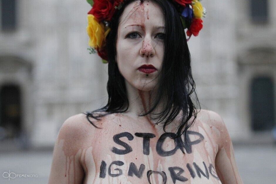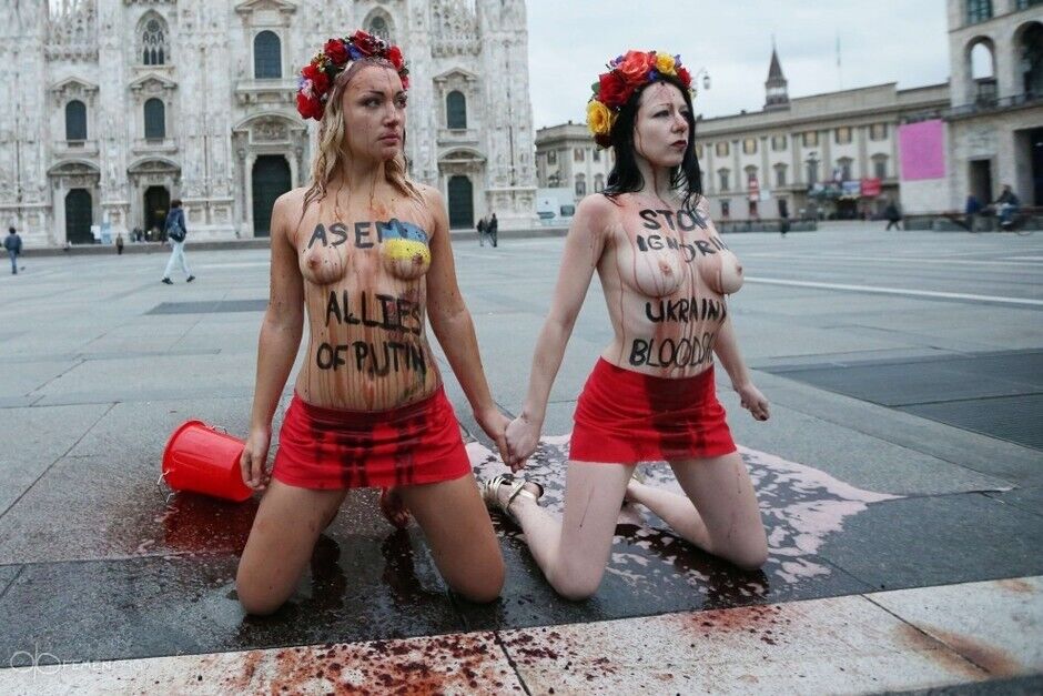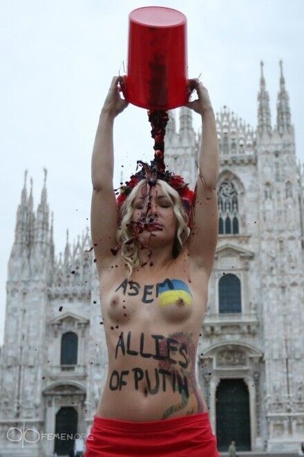 В четверг, 16 октября, в Милане перед открытием форума "Азия – Европа" (АСЕМ) две активистки движения Femen устроили акцию в поддержку Украины. Возле главного собора Милана они обнажились и вылили на себя ведра с красным вином, что символизировало кровь, пролитую на войне в Украине. Свою акцию, как сообщается на сайте движения, активистки назвали Blood Bucket Challenge и приурочили ее к прибытию в Милан президента России Владимира Путина. "Тюремный дворик Гаагского трибунала должен стать единственной европейской площадкой для Путина. Смерть диктатуре! Нет войне в Украине!", – заявили активистки.