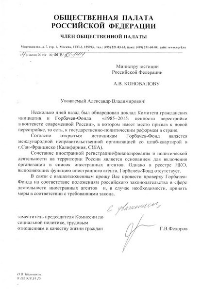 С просьбой о проверке "Горбачев-Фонда" на соответствие закону об "иностранных агентах" в Министерство юстиции РФ обратился член общественной палаты Георгий Федоров.