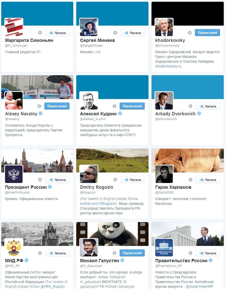 В частности, премьер якобы подписан на Алексея Навального, Алексея Кудрина, Аркадия Дворковича, Маргариту Симоньян, Тину Канделаки, Дмитрия Рогозина, Владимира Жириновского, Михаила Ходорковского, а также Гарика "Бульдога" Харламова, Михаила Галустяна и Павла Волю.