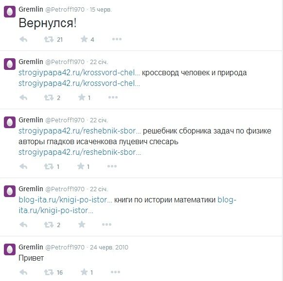 На самой странице @Petroff1970 размещено пять несвязанных твитов.
