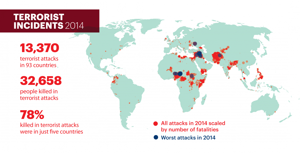 По данным Института экономики и мира, вина за более чем половину этих смертей (51%) лежит на группировках "Боко Харам" и ИГИЛ.Эксперты отмечают, что в 2014 году терроризм был преимущественно сконцентрирован в пяти странах – 78% его жертв пришлось на Сирию, Ирак, Афганистан, Нигерию и Пакистан. Самая тяжелая ситуация сложилась в Ираке – там от рук экстремистов в 2014 году погибли почти 10 тыс. человек, что стало самым высоким показателем за всю историю страны. Сильный всплеск террористических атак произошел в Нигерии, где число жертв терактов по сравнению с 2013 годом возросло на 300% и составило более 7,5 тыс. человек.По данным Института экономики и мира, угроза терактов в странах Запада в 2014 году была значительно ниже, так как там подобные нападения, как правило, совершаются "одиночками" на почве политического экстремизма, национализма или религиозных убеждений, а не на почве исламского фундаментализма.