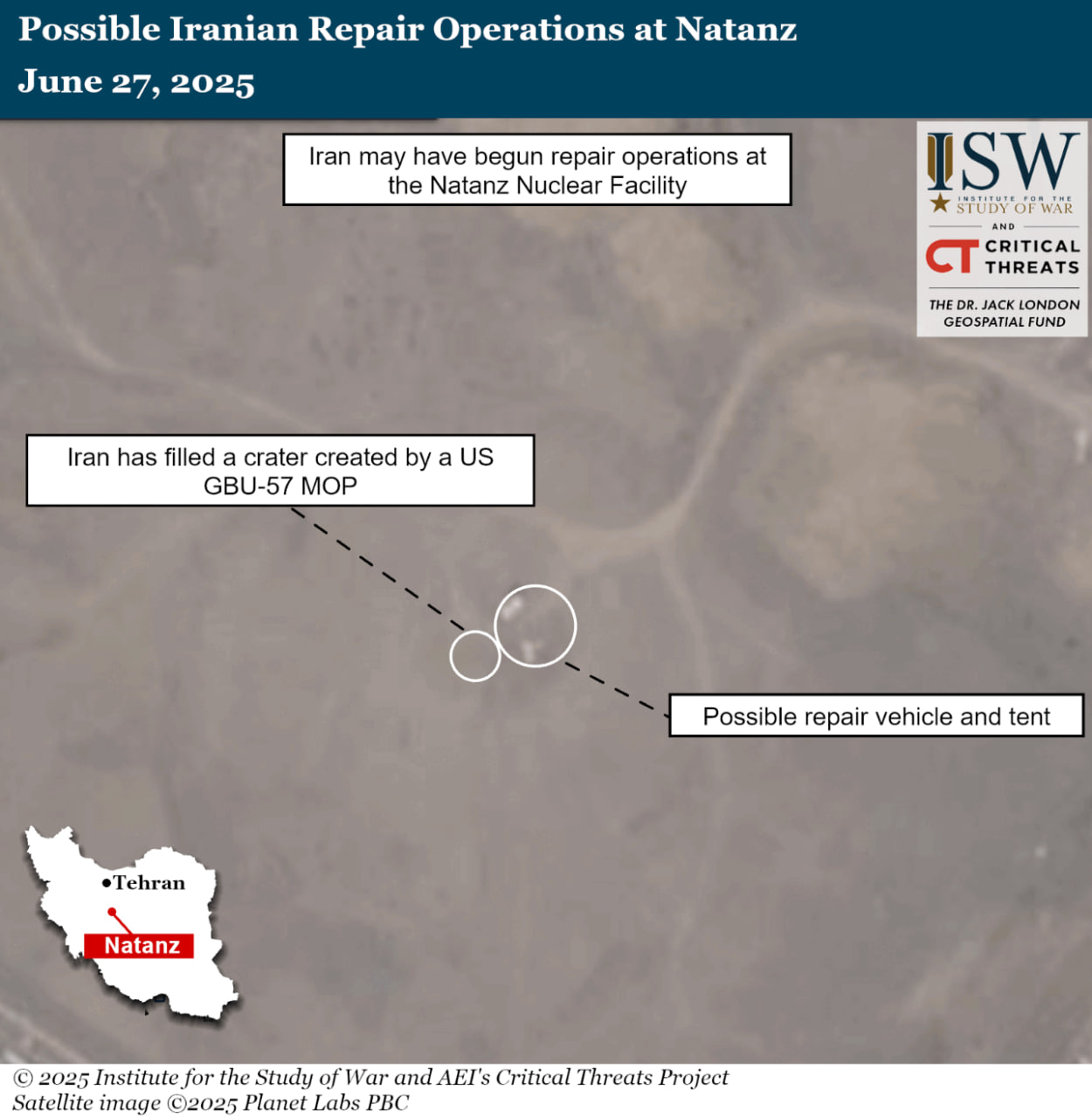 Эксперты проанализировали спутниковые снимки завода и заявили, что на них зафиксирован засыпанный кратер, образовавшийся в результате поражения американскими бомбами. Также на фото обнаружили палатки и грузовик, что может свидетельствовать о начале восстановительных работ.
