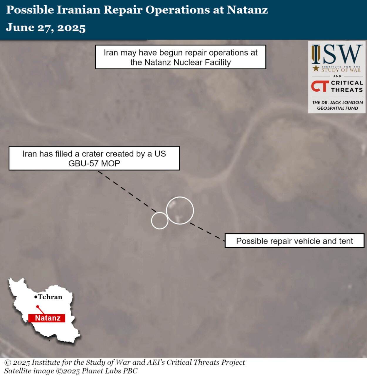 Иран, вероятно, приступил к ремонтным работам на поврежденном вследствие удара США объекте по обогащению урана в Нетензе. Об этом говорится в отчете американского Института изучения войны (ISW) за 28 июня.
