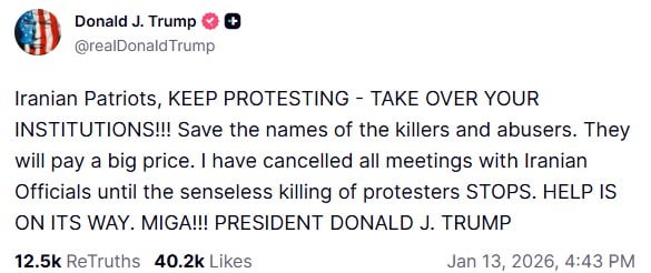 Трамп отметил, что отменил все встречи с иранскими чиновниками, "пока не прекратятся бессмысленные убийства протестующих".