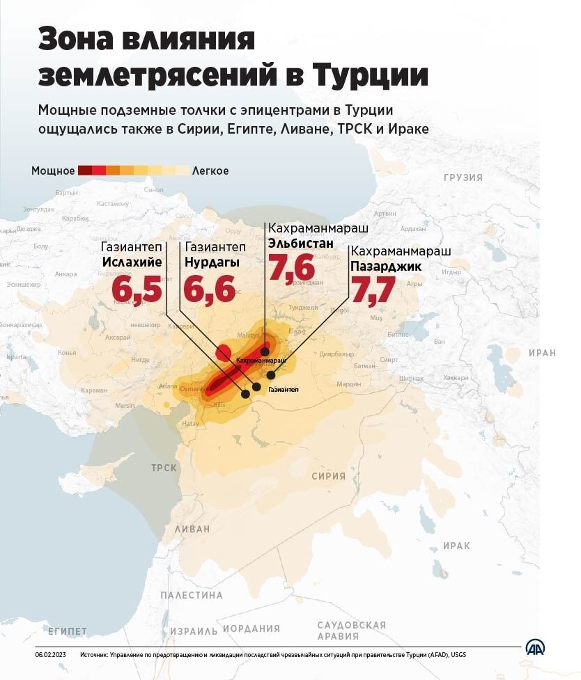 В ведомстве уточнили, что произошло два землетрясения. Первое – в ночь на 6 февраля, в 4.17 по местному времени (3.17 по Киеву) в районе Пазарджик провинции Кахраманмараш магнитудой 7,7. Второе – в Эльбистане в 13.24 по местному времени (12.24 по Киеву) магнитудой 7,6.