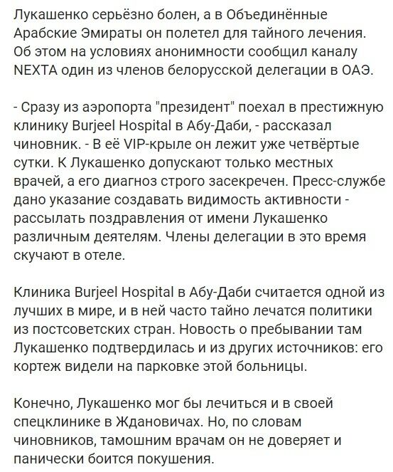 "Сразу из аэропорта президент поехал в престижную клинику Burjeel Hospital в Абу-Даби. В ее VIP-крыле он лежит уже четвертые сутки. К Лукашенко допускают только местных врачей, а его диагноз строго засекречен. Пресс-службе дано указание создавать видимость активности – рассылать поздравления от имени Лукашенко различным деятелям. Члены делегации в это время скучают в отеле", – рассказал блогеру член делегации.