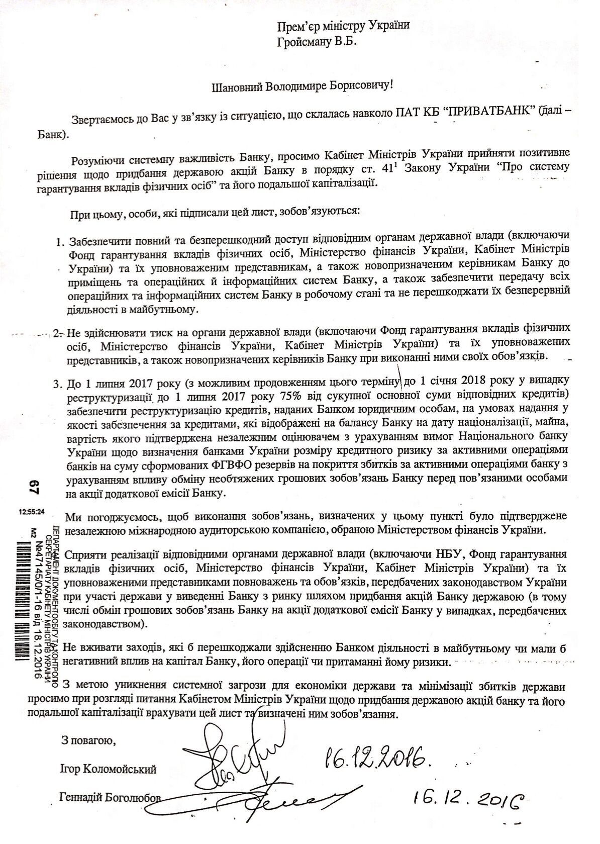 Письмо бывших ключевых акционеров "ПриватБанка" Игоря Коломойского и Геннадия Боголюбова с просьбой национализировать банк датировалось 16 декабря 2016 года, сообщили в Минфине.
