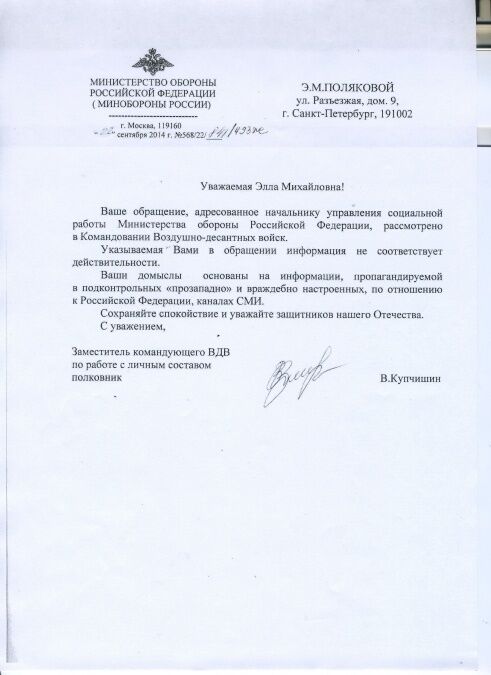 Какие именно СМИ ведомство имеет в виду, в ответе не уточняется. Документ подписал заместитель командующего ВДВ по работе с личным составом Виктор Купчишин.