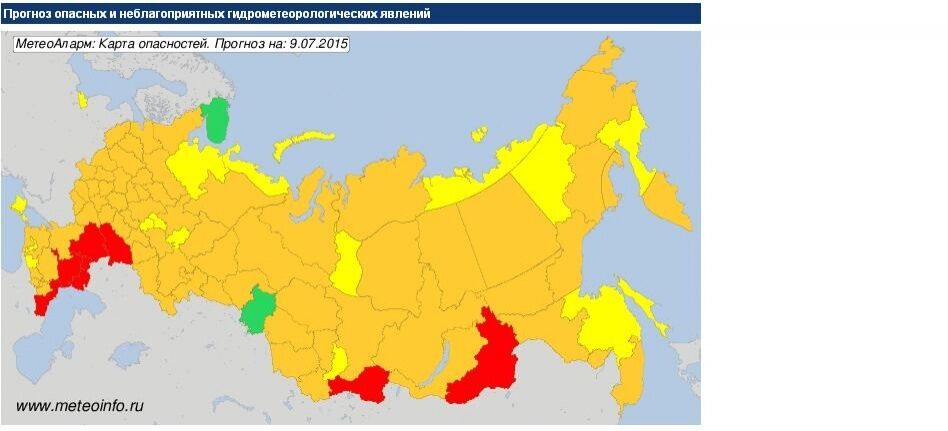 Кроме столицы, в прогнозе на 9 июля "оранжевый" уровень опасности присвоен большей части территории России, а несколько регионов в трех федеральных округах: Южном, Кавказском и Сибирском – получили самый высокий "красный" уровень.