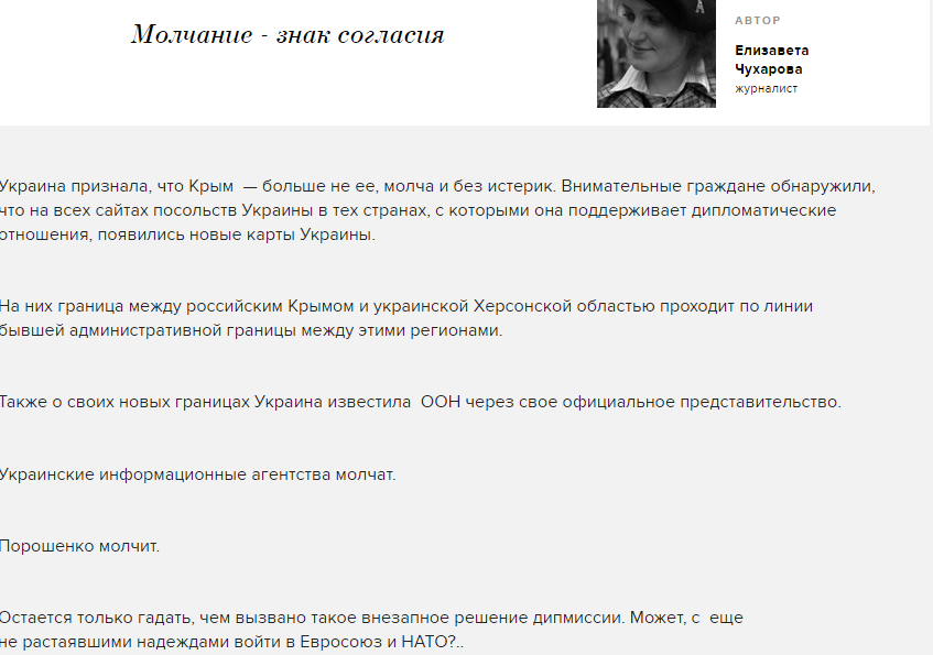 "Украина признала, что Крым – больше не ее, молча и без истерик. Внимательные граждане обнаружили, что на всех сайтах посольств Украины в тех странах, с которыми она поддерживает дипломатические отношения, появились новые карты Украины. На них граница между российским Крымом и украинской Херсонской областью проходит по линии бывшей административной границы между этими регионами", – говорится в статье Чухаровой.