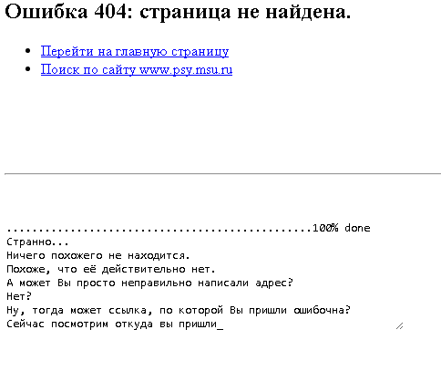 В процессе поиска веб-сервер сообщает сведения о собеседнике – с какой страницы тот перешел на "404-ю" и каким браузером пользуется. Затем рассказывает, чем занимаются на факультете психологии и жалуется на свою нелегкую судьбу.