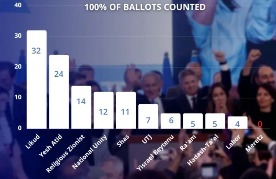 "Ликуд" получила 32 мандата из 120 и теперь имеет право создать коалицию и сформировать правительство. Его может возглавить Нетаньяху.