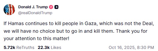"Если ХАМАС продолжит убивать людей в Газе, что не было частью соглашения, у нас не будет другого выбора, как вмешаться и убить их", – указал Трамп в Truth Social 16 октября.