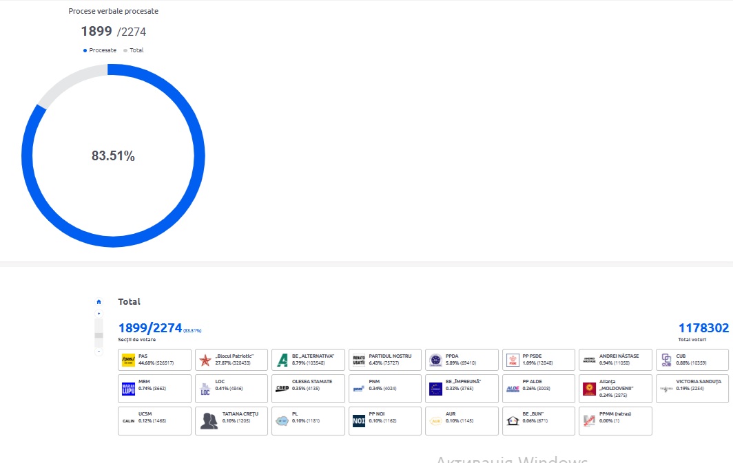 Проевропейская PAS после подсчета 83,51% голосов набирает 44,68%.