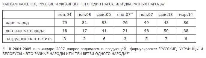 Так, если в декабре 2013 года 43% респондентов считали россиян и украинцев одним народом, то в марте 2014 года таких стало 56%. При этом 38% опрошенных считают, что это два разных народа, 6% – затруднились с ответом.
