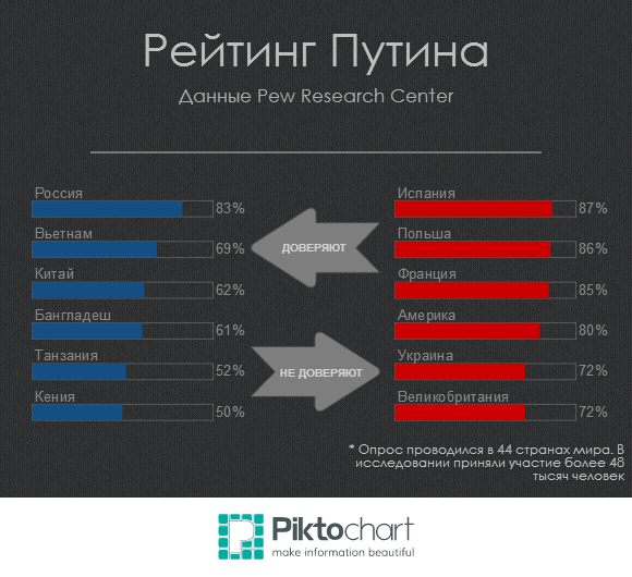Путину не доверяют 87% испанцев, 86% поляков, 85% французов, 83% египтян, 80% американцев, 79% иорданцев, 78% итальянцев, 77% немцев, 75% турок, по 72% украинцев, японцев и британцев, 71% израильтян и 70% венесуэльцев.