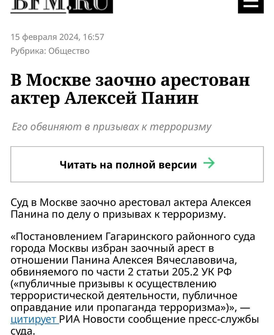 "Сплю, никого не трогаю, а оказывается меня уже посадили. Страна непуганых идиотов", – написал Панин в Instagram, разместив скриншот новости, опубликованной на одном из российских сайтов.