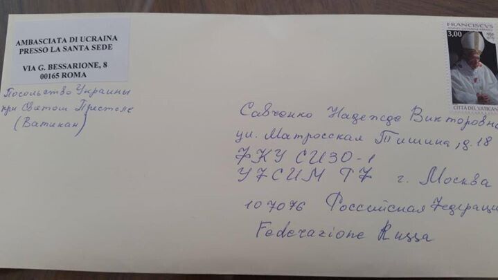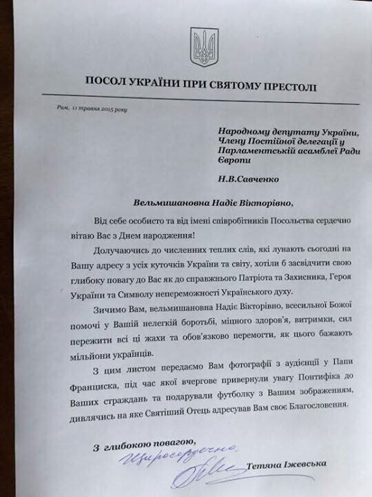 "11 мая день рождения Героя Украины Надежды Савченко. По этому случаю посольство Украины при Святом Престоле отправило письмо поддержки народному депутату Украины, а также фото с аудиенции у Папы Франциска, на которой понтифик был проинформирован о судьбе украинской летчицы и ему была подарена футболка с ее изображением", – говорится в сообщении.