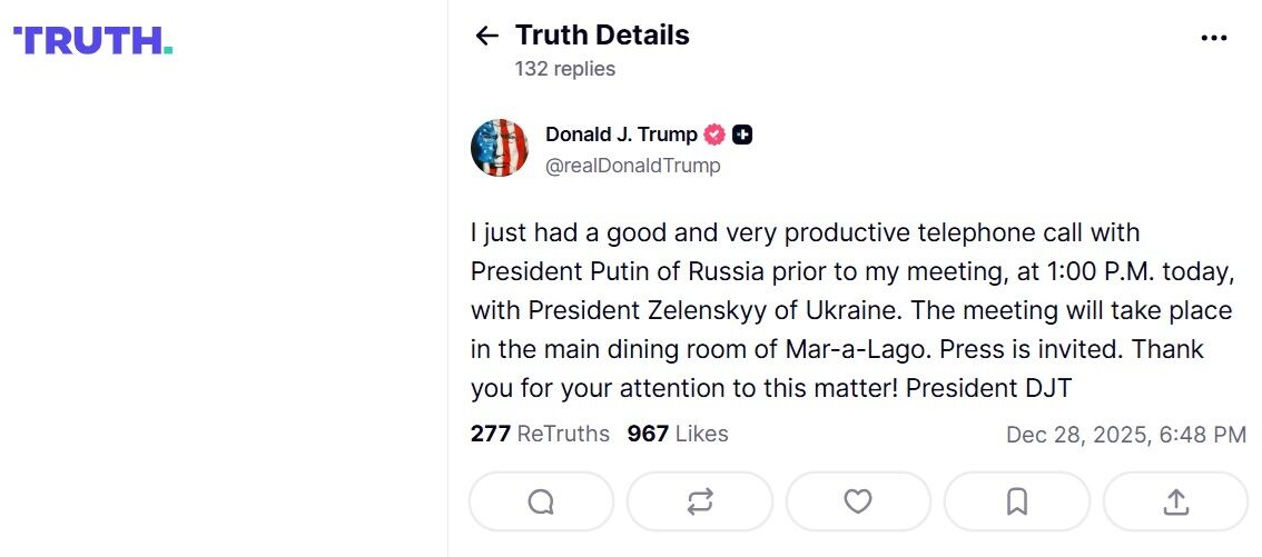 28 декабря президент США Дональд Трамп сообщил в своей соцсети Truth Social, что провел разговор с нелегитимным президентом страны-агрессора России Владимиром Путиным.
