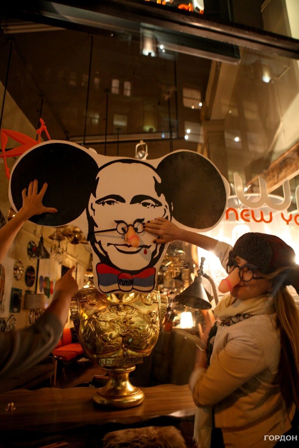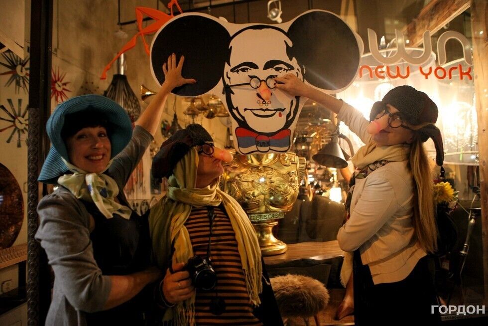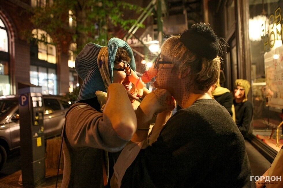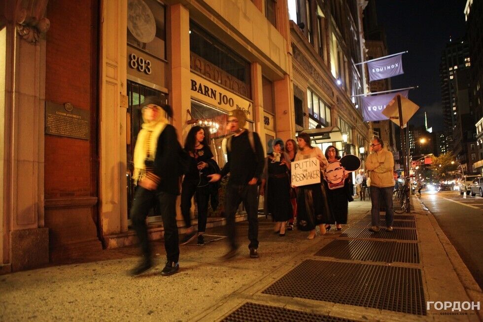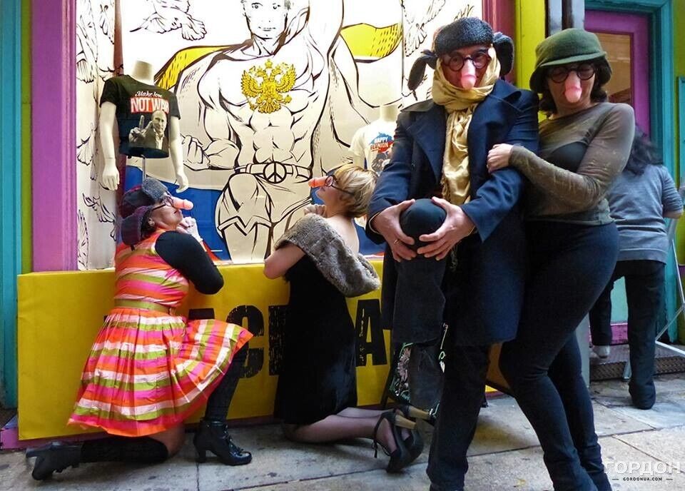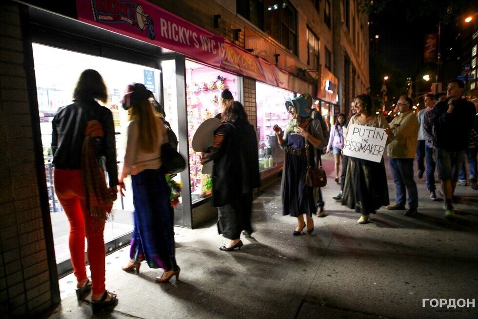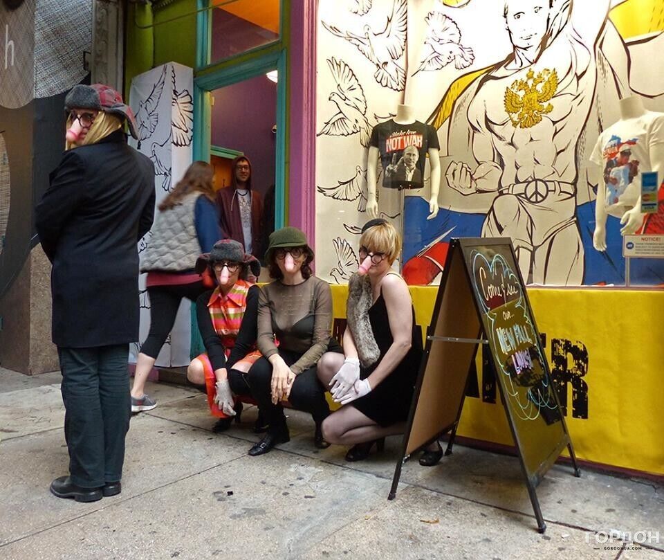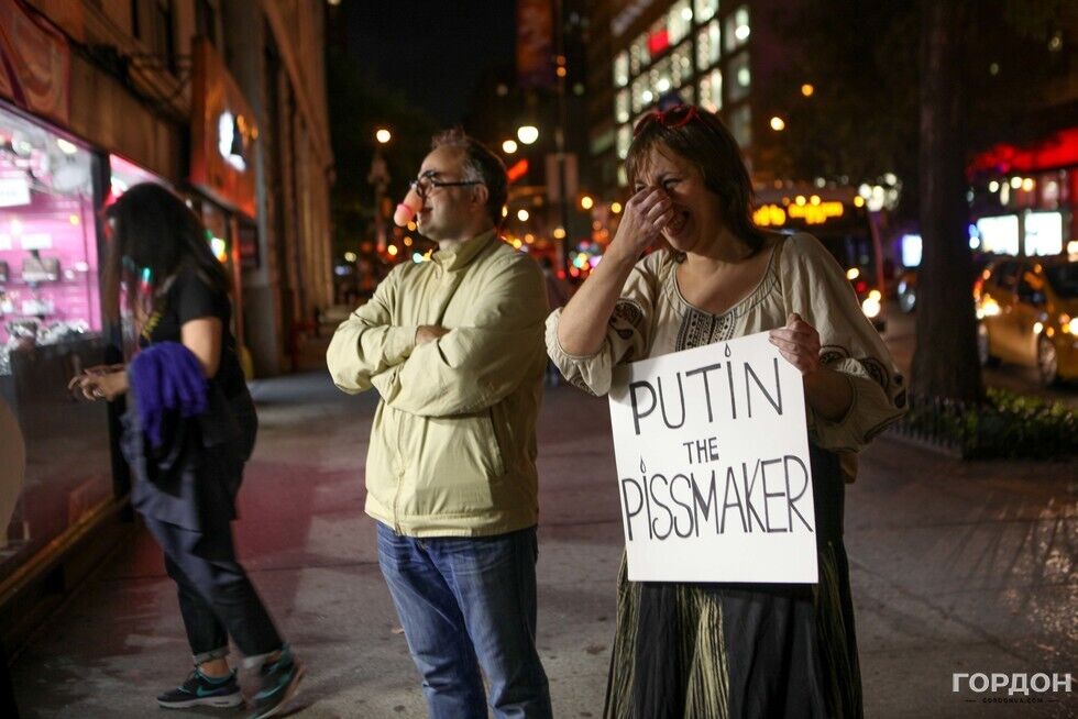 Вечером в воскресенье, 27 сентября, в Нью-Йорке состоялась сатирическая акция художников и артистов – эмигрантов из Украины и России, направленная против политики президента РФ Владимира Путина, передает корреспондент издания "ГОРДОН" в Нью-Йорке Юлия Городецкая. На акцию пришли 15 человек, у большинства из них на носах были маски в виде мужского члена. С портретом Путина с ушами Чебурашки и плакатом с надписью Putin is pissmaker ("Путин – мочетворец") участники прошлись по улицам Манхэттена. Жители Нью-Йорка приветствовали процессию и реагировали на нее криками Great! ("Отлично") и Gorgeous! ("Великолепно"). Кроме того, по дороге артисты напевали известную песню футбольных фанатов о Путине. Впервые подобная акция прошла в Нью-Йорке в октябре 2014 года. Тогда в витрине одного из магазинов на Манхэттене появился портрет президента РФ с подписью Peacemaker ("Миротворец"). С тех пор эта витрина исчезла, там появился новый магазин, но художники продолжают собираться на свои уличные перформансы. Внутри новости – фоторепортаж.