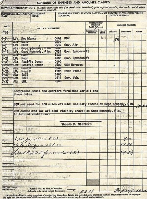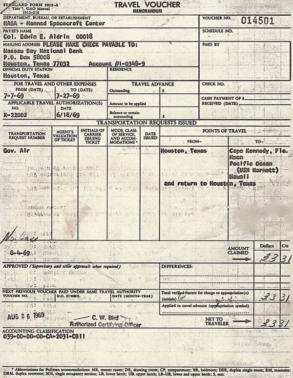 Помимо этого, космонавт опубликовал там же таможенную декларацию, заполненную после возвращения на Землю. Документ представляет собой командировочное удостоверение по форме 1082-A, выписанное полковнику Олдрину на поездку в оба конца. Весь первый полет человека на Луну в документе представлен в виде списка адресов: мыс Кеннеди, Флорида (так в 1964–1973 годах назывался мыс Канаверал), Луна, Тихий океан (корабль ВМС США Hornet), Гавайские острова.