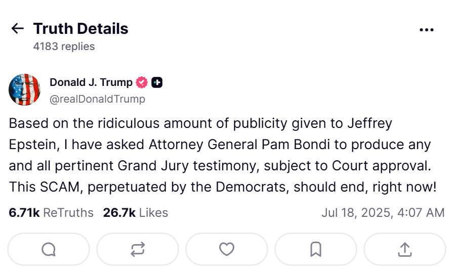 "Учитывая смехотворное количество огласки, предоставленной Джеффри Эпштейну, я попросил генерального прокурора Пэм Бонди предоставить любые соответствующие показания большого жюри, при условии одобрения суда. Этот обман, организованный демократами, должен прекратиться немедленно!" – заявил президент США.