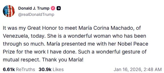Трамп после встречи с Мачадо 16 января опубликовал в Truth Social пост, в котором назвал ее "замечательной женщиной, прошедшей через многое".