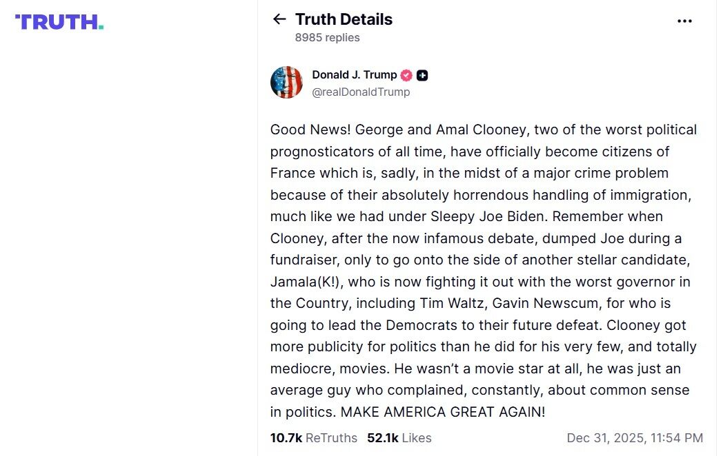 1 января президент США Дональд Трамп в своей соцсети Truth Social раскритиковал американского актера Джорджа Клуни и его жену, юристку и писательницу Амаль Клуни, которым предоставили французское гражданство.