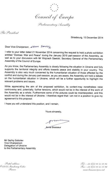Президент Парламентской ассамблеи Совета Европы Анн Брассер запретила проведение фотовыставки "Донбасс - Война и Мир" в течение зимней части сессии Ассамблеи в Страсбурге, заявив, что она может привести к росту напряженности, так как некоторые фотографии могут быть неправильно поняты.