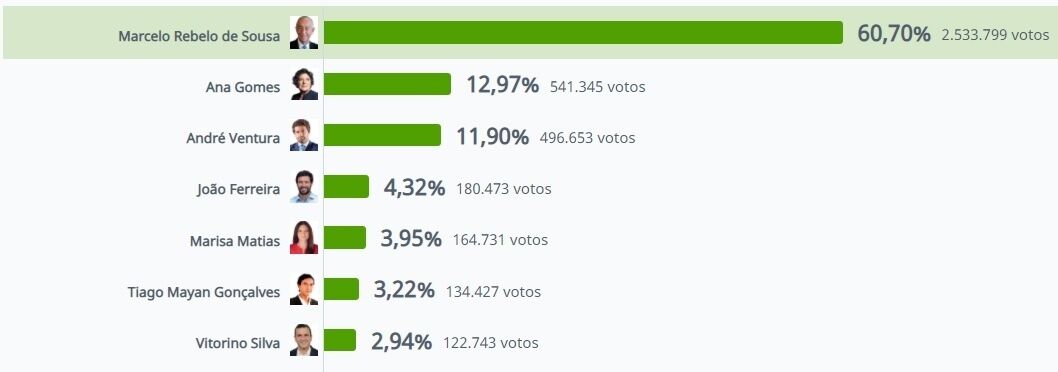 После подсчета 99,91% голосов избирателей на президентских выборах в Португалии оказалось, что действующий глава государства Марселу Ребелу ди Соуза набрал в четыре раза больше голосов, чем ближайший конкурент.