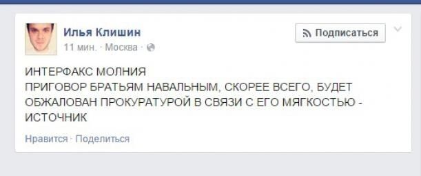 О вероятном обжаловании прокуратурой приговора братьям Навальным в связи с его мягкостью сообщил "Интерфаксу" собственный источник, передает корреспондент телеканала "Дождь" Илья Кашин.