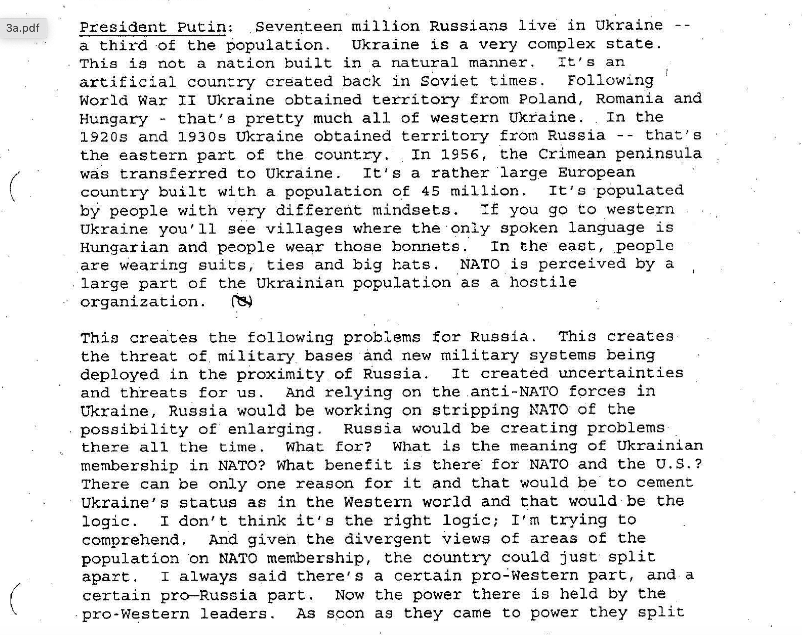 "Какой смысл в членстве Украины в НАТО? Какая выгода от этого для НАТО и США? Может быть только одна причина – укрепить статус Украины в западном мире, и это было бы логично. Я не считаю, что это правильная логика; я пытаюсь понять. А учитывая разные мнения населения относительно членства в НАТО, страна может просто разделиться. Я всегда говорил, что есть определенная прозападная часть и определенная пророссийская часть", – заявил Путин.