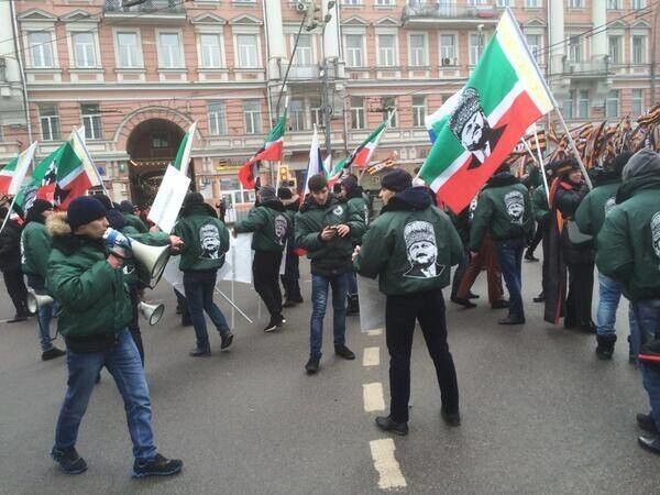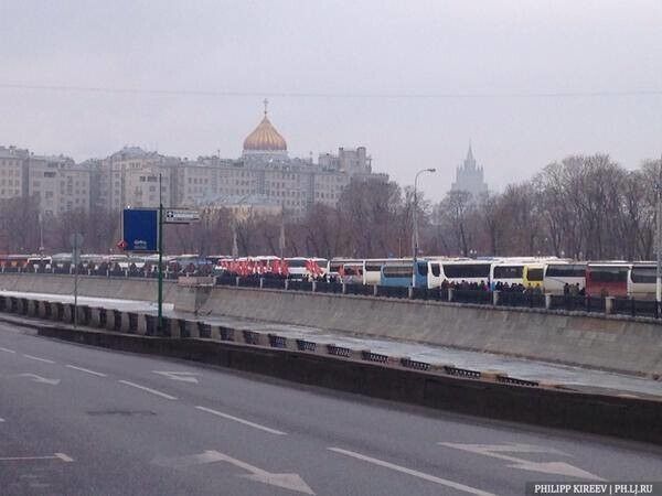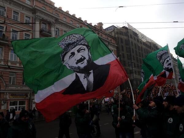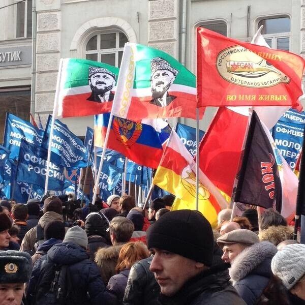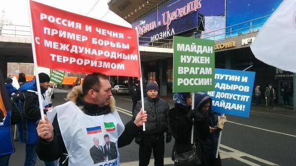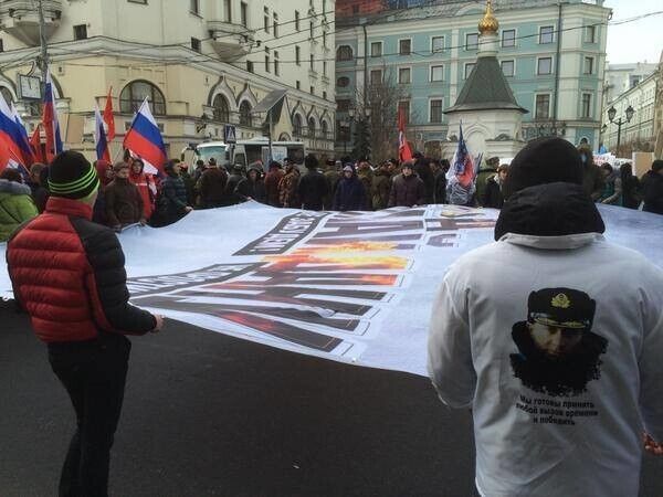 В центре Москвы проходит акция "Антимайдан". Как заявили организаторы, их митинг организован, чтобы противостоять тем, кто угрожает России. Судя по лозунгам, РФ грозит западная идеология, гей-парады и майдан. А президент России Владимир Путин и глава Чечни Рамзан Кадыров майдан не допустят. Один из плакатов гласит: "Путинизм навсегда". В колонне митингующих рядом с главой байкерского клуба "Ночные волки" Александром Залдостановым идет экс-нардеп Олег Царев.