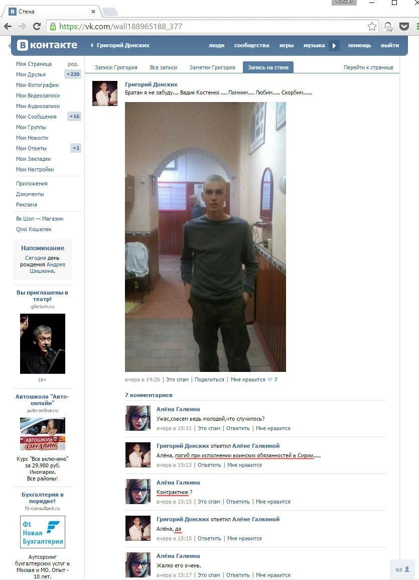 Солдат-контрактник 19-летний Вадим Костенко с Кубани погиб в Сирии 24 октября, сообщили РБК его родственники.