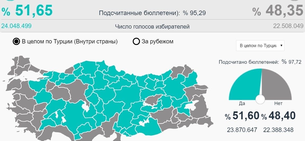 По состоянию на 19.30 посчитано более 95% бюллетеней. Усиление полномочий президента страны поддерживает почти 52%, против этого выступают около 48% избирателей.