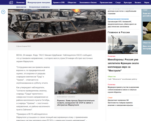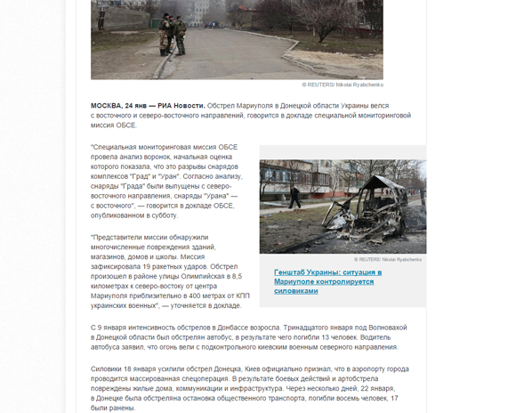 Государственные российские информагентства "РИА Новости" и ИТАР-ТАСС удалили из новостей о предварительном отчете ОБСЕ по обстрелу Мариуполя упоминание о том, что снаряды были выпущены с территорий, подконтрольных боевикам "ДНР".