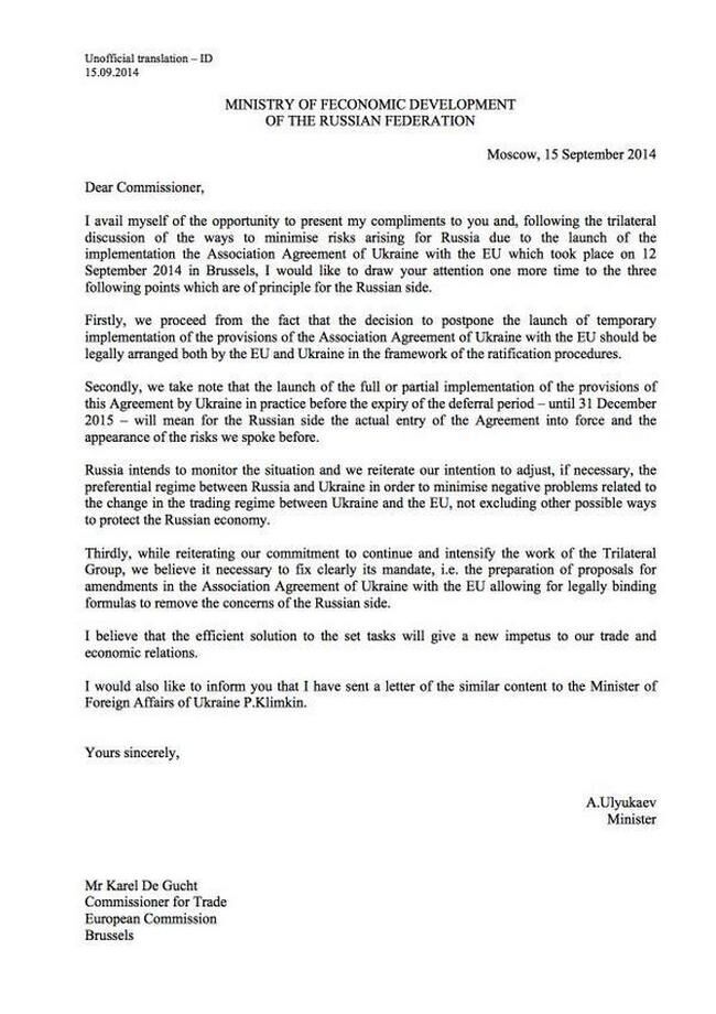 Глава Мининистерства экономики и развития РФ Алексей Улюкаев направил еврокомиссару по вопросам торговли Карлу де Гухту письмо с требованием рассмотреть три принципиальных пункта относительно соглашения об ассоциации.