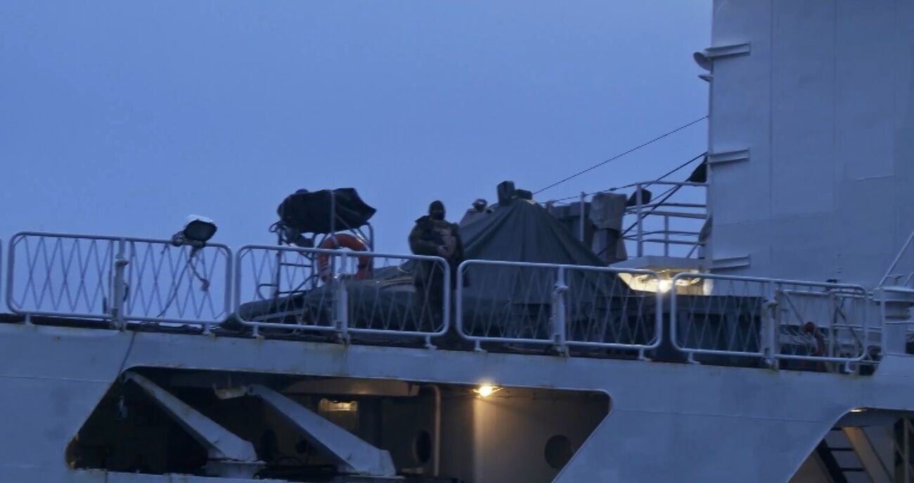 Журналисты смогли определить местонахождение российского военного корабля и даже попытались подплыть к нему на быстроходной резиновой лодке. На палубе они заметили несколько человек с закрытыми лицами, в том числе мужчину в форме и бронежилете, вооруженного российской военной винтовкой.