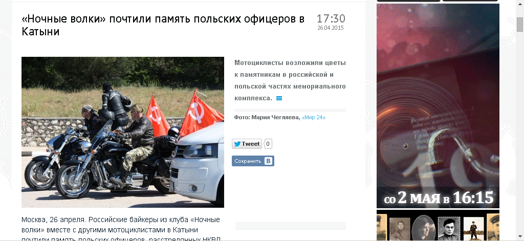 Примечательно, что все издания ссылаются на "Радио Польша", которое сообщило, что "участники мотопробега Москва – Берлин почтили память польских офицеров в Катыни".