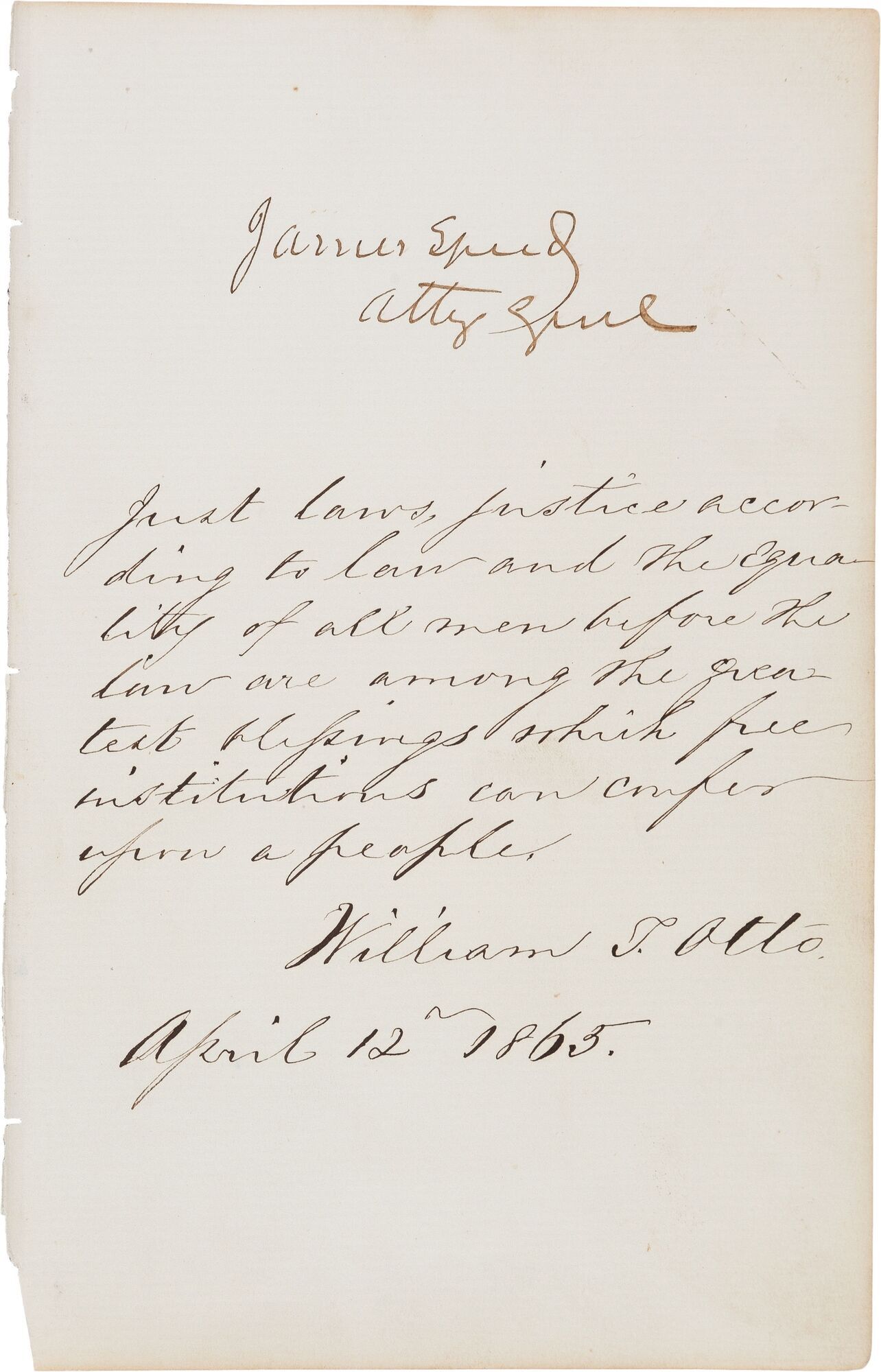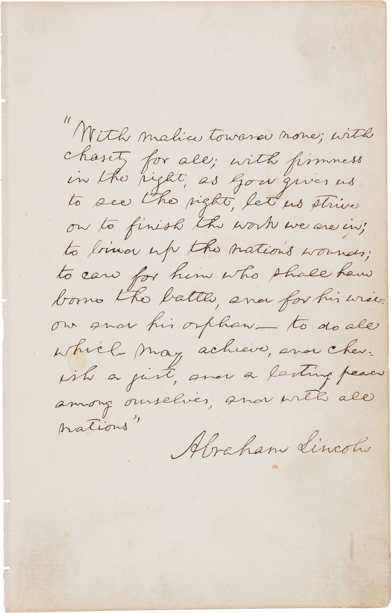 "Рукопись, подписанная Линкольном в марте 1865 года, также содержит знаменитый отрывок из второй инаугурационной речи президента", – говорится в сообщении аукционного дома.