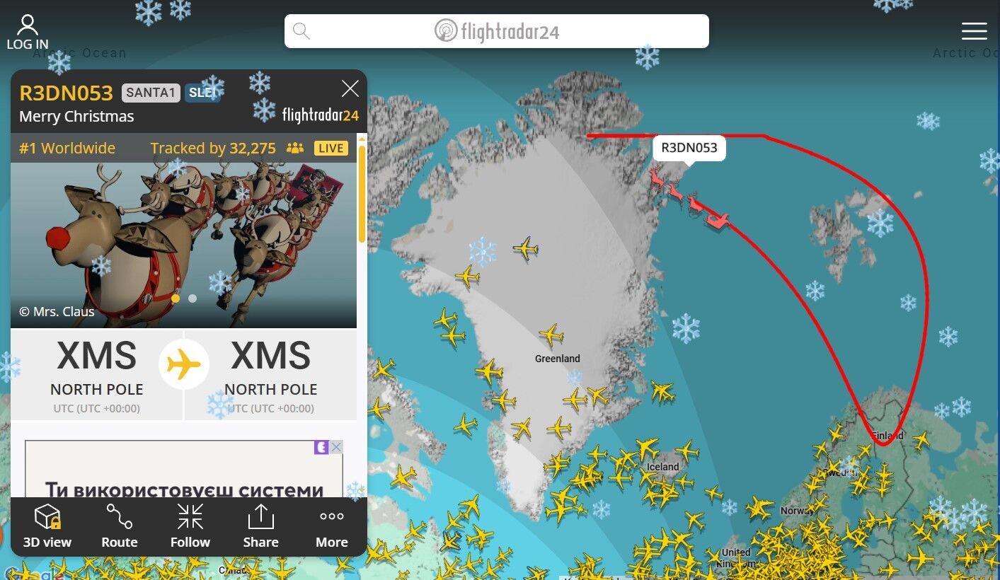 23 декабря Санта-Клаус отправился с Северного полюса в свое ежегодное рождественское путешествие по миру. Его полет можно отследить на портале Flightradar24.