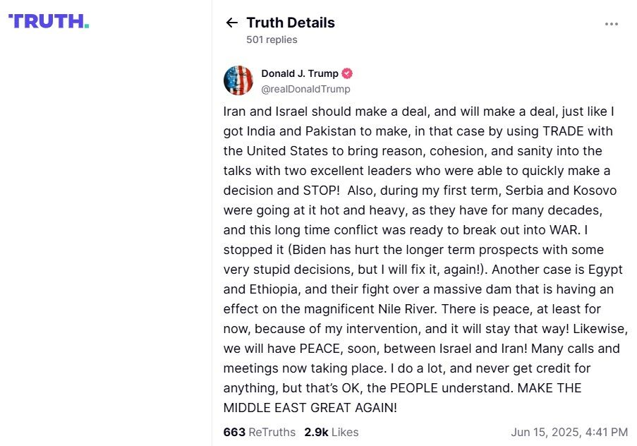 15 июня Трамп заявил, что можно "легко заключить сделку между Ираном и Израилем и положить конец этому кровавому конфликту".