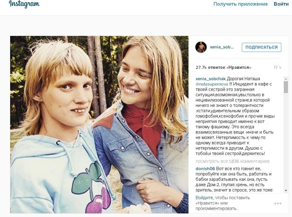 "Дорогая Наташа! Инцидент в кафе с твоей сестрой – это загранная ситуация, возможная, увы, только в нецивилизованной стране, в которой ничего не знают о толерантности, кстати, удивительным образом гомофобия, ксенофобия и прочие виды неприятия приводят именно к вот такому фашизму. Это всегда взаимосвязанные вещи – иначе и быть не может. Нетерпимость к чему-то одному всегда приводит к нетерпимости в другом. Душою с тобой и твоей сестрой, держитесь!" – написала Собчак.