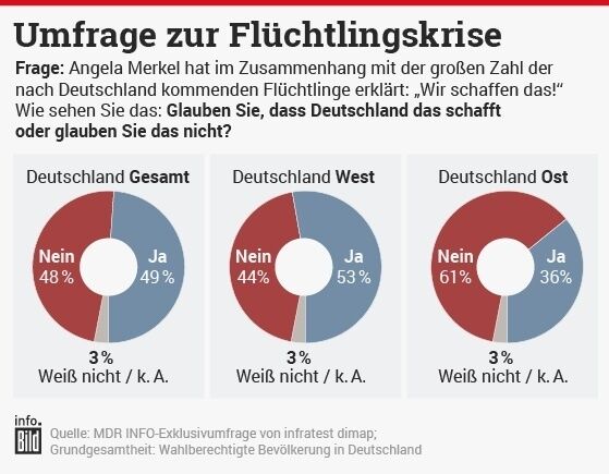 Согласно исследованию Меркель теряет поддержку из-за политики в отношении беженцев с Ближнего Востока. Так, 47% опрошенных считают нынешнее урегулирование миграционного кризиса неправильным. В свою очередь, 40% немцев поддерживают действия правительства в этом направлении.