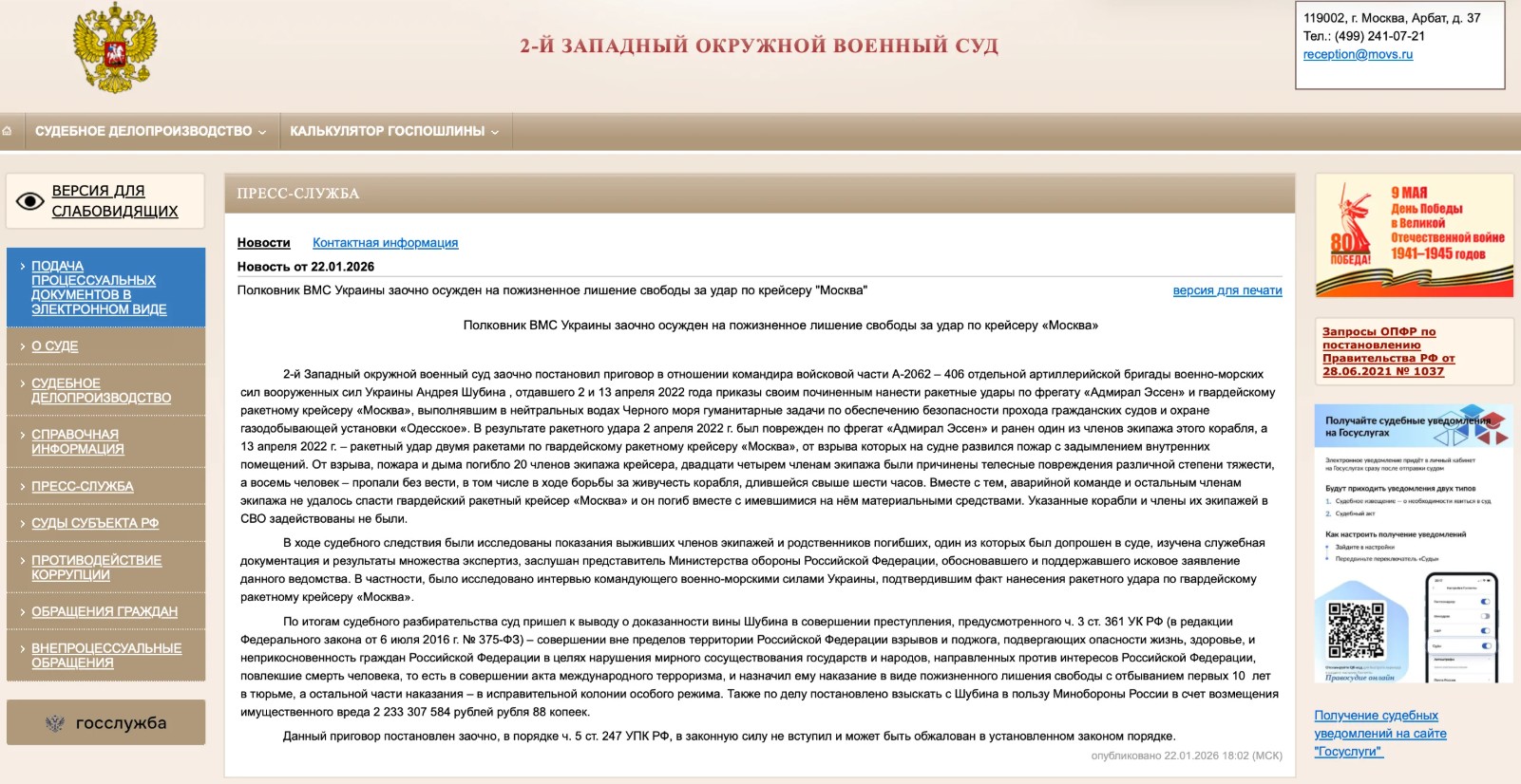 В релизе суд впервые признал, что по "Москве" нанесли ракетный удар. Ранее российское минобороны утверждало, что на крейсере произошел пожар, который привел к детонации боезаряда.