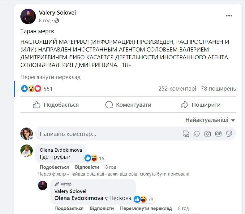 Соловей после этого написал в Facebook, что "тиран мертв", в комментариях к посту он добавил, что "пруфы" – у пресс-секретаря главы Кремля Дмитрия Пескова.