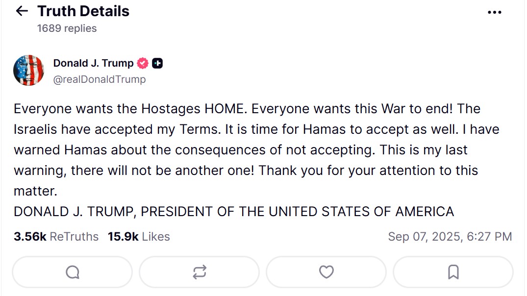 "Все хотят, чтобы заложники вернулись домой. Все хотят, чтобы эта война закончилась! Израильтяне приняли мои условия. Время, чтобы ХАМАС тоже их принял. Я предупреждал ХАМАС о последствиях неприятия. Это мое последнее предупреждение, другого не будет!" – написал Трамп.