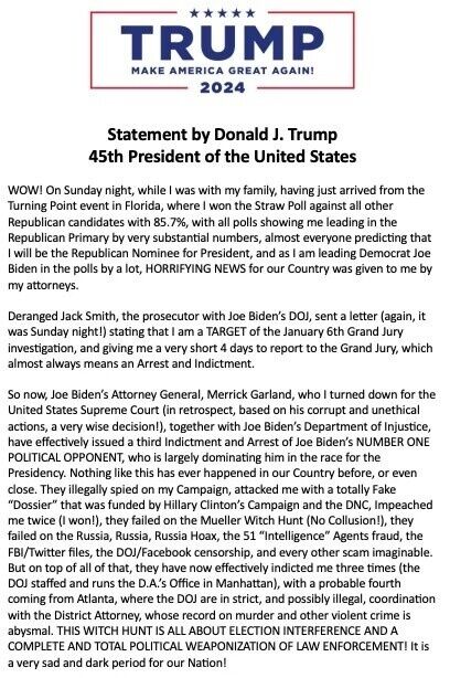 "Ненормальный Джек Смит, прокурор министерства юстиции Джо Байдена, прислал письмо (опять же, это было в воскресенье вечером!), в котором говорилось, что я являюсь объектом расследования Большого жюри 6 января, и дал мне очень короткие четыре дня на то, чтобы отчитаться перед Большим жюри, что почти всегда означает арест и обвинение", – написал он.